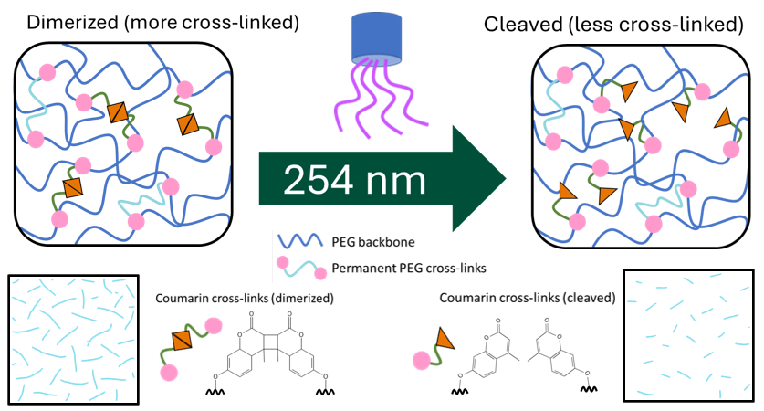 Allie’s paper - Photoswitchable Cross-Linking in Polymer Gels: Effects on Surface Creasing and Network Relaxation during Swelling - was just published in Macromolecules. We use photo-responsive cross-linkers (based in coumarin) to manipulate the dynamics of swelling-induced surface instabilities of polymer gels (i.e., we help 'turn off' surface features more quickly by relieving internal stresses via cross-link density). Congratulations to co-author Surbhi Punhani-Schillinger and undergraduate authors Reed Blocksome and Aditya Ketkar. Check it out!